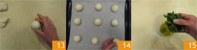 Shape the dough balls 13 and place them on one or more baking sheets lined with parchment paper (at least 2 inches apart from each other) 14. Let the montanarine rise again for 30 minutes away from drafts or air currents at about 77°F (optionally cover with soft plastic wrap in contact). Meanwhile, pour oil and parsley into a tall container 15.