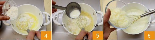 Then remove it from the heat to add the flour little by little 4, stirring with a whisk to avoid lumps. Put the saucepan back on the heat and toast the flour for a few moments, stirring constantly, and when it becomes golden, add the milk at room temperature or slightly warmed 5. Stir continuously and season with a grating of nutmeg. Then once it reaches boiling, turn off the heat and add the grated Asiago cheese 6.