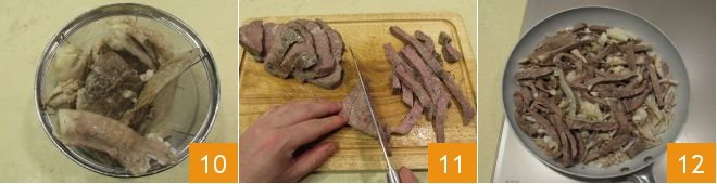 Once cooked, remove the offal, drain well 10, and cut into strips 11. Sauté all the offal in a pan to dry them 12.