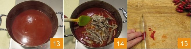 When the tomato sauce is well reduced 13, add the tripe and the rest of the offal 14. Continue cooking for 1 and a half hours. Chop the chili pepper with a knife 15.