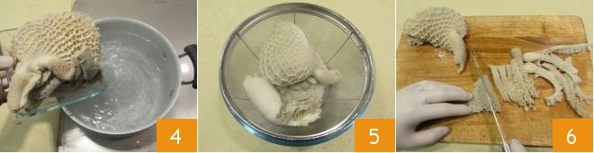 Meanwhile, focus on cleaning the offal: rinse thoroughly under running water, or alternatively, you can ask your trusted butcher for pre-cleaned offal. Boil the tripe for 25 minutes 4, or until the meat is tender, then drain 5 and cut into strips 6.