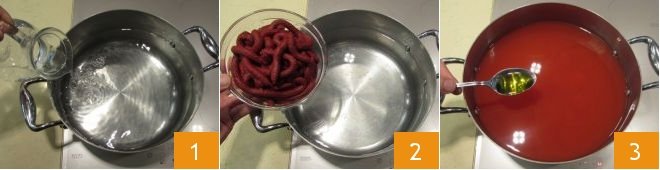 To prepare Morzello, pour water into a large pot 1 and dissolve the tomato paste in it 2, add salt, olive oil 3, and let the sauce reduce for about 3 hours over medium heat, or until it thickens well. This cooking process will allow you to obtain an intensely flavored sauce to best season the offal.