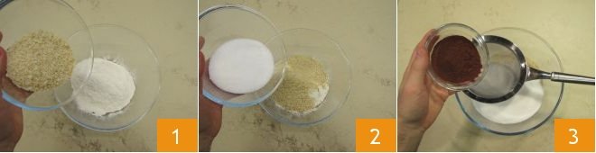 To prepare Neapolitan mostaccioli, start by pouring the flour, almond granules 1, and sugar 2 into a bowl. Then sift the unsweetened cocoa powder 3,