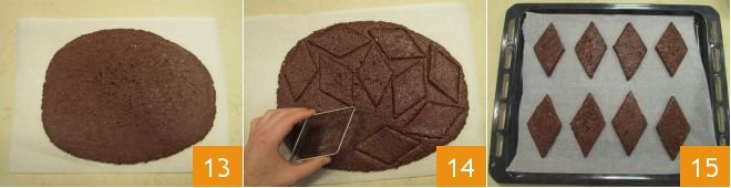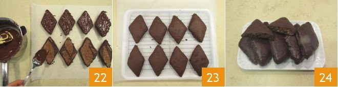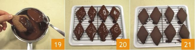Place 8 diamonds at a time on the baking sheet and proceed with the various batches: bake in a hot oven at 356°F for about 18 minutes 16. Once baked, let them cool completely on a wire rack before glazing. Coarsely chop the dark chocolate 17 and let it melt in a double boiler, stirring to prevent burning 18.
