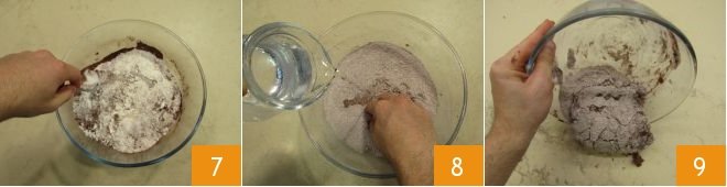 and mix everything well 7. Gradually pour in the room temperature water, paying attention to the necessary amount: the dough might require slightly more or less. As you pour in the water, knead with your other hand 8. Once you have a homogeneous mixture, transfer it to the pastry board 9.