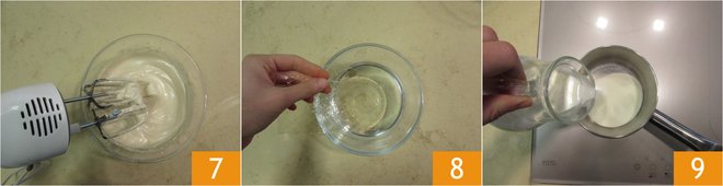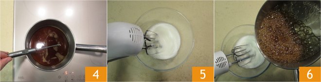 When the syrup reaches the temperature 4 and the egg whites are well-beaten 5, pour it in a thin stream into the egg whites 6 while continuing to beat with the mixers.