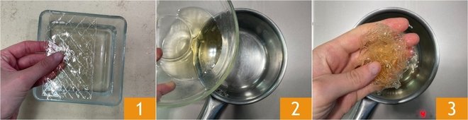 To make the fig and nut mousse, first soak the gelatin sheets in cold water 1. Pour the rum into a saucepan and heat it gently 2, then add the well-wrung gelatin sheets 3.