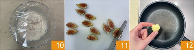 Cover the bowl with plastic wrap and let it set in the refrigerator for 30 minutes 10. Meanwhile, cut the figs into 4 wedges, without peeling them 11. Melt the butter in a non-stick pan 12.