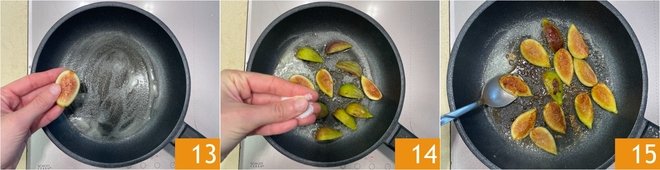 Place the figs in the pan 13, then add the sugar 14 and brown over medium-high heat for a few minutes, so they get some color 15.