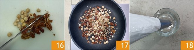 Finally, coarsely chop the pecans and hazelnuts 16, then briefly toast them in a pan 17. You are ready to assemble the dessert: fill 2 glasses with a capacity of 7 oz with the mousse that you have transferred into a pastry bag with an 8 mm star nozzle 18.