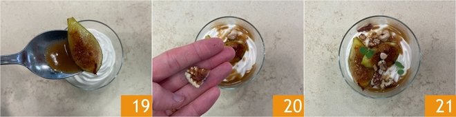 Garnish the glasses with the figs 19 and nuts 20, then complete with marjoram leaves. Your mousse with figs and nuts is ready to be served 21!