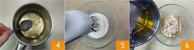 Stir with a teaspoon to completely dissolve the gelatin 4 and let it cool. Meanwhile, semi-whip the cream with electric beaters 5. Pour the caramel yogurt into a bowl, then add the cooled rum with the gelatin 6.