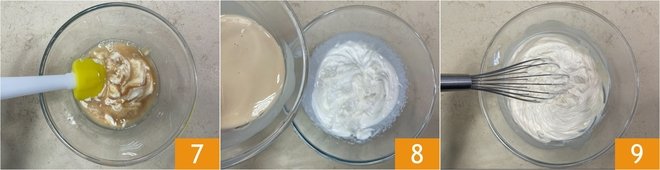 Mix to combine the mixture 7, then add the semi-whipped cream 8 and incorporate it with a hand whisk 9.