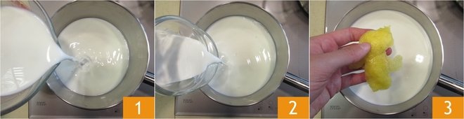 To prepare the mousseline cream, first pour the milk 1 and cream 2 into a saucepan. Add the lemon zest 3.