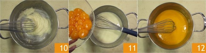 Mix with the whisk until you get a sort of smooth béchamel 10. At this point, add the egg yolks 11 and mix with the whisk 12.
