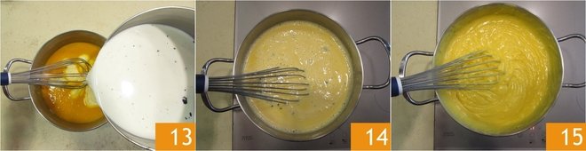 Pour in the remaining milk 13, continuing to stir with the whisk. Return to the heat and keep stirring 14 until it thickens 15.