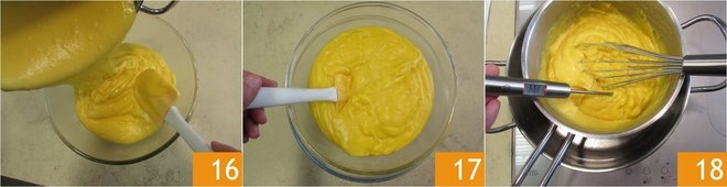 As soon as it starts to boil, turn off the heat and transfer the cream into a bowl 16. Then place this bowl in an ice water bath. Stir every 2-3 minutes to cool it down. When the cream is cold, heat it in the microwave or in a water bath 18 until it reaches a temperature of 79°F.