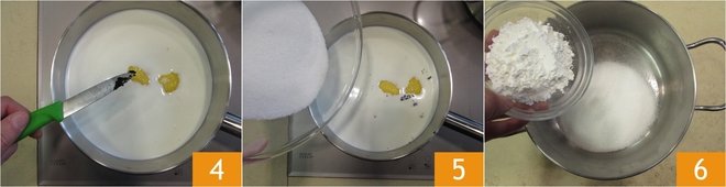Also add the vanilla bean seeds 4 and half of the sugar 5. Then bring to a boil over low heat. In another pot, combine the remaining sugar and previously sifted cornstarch 6.