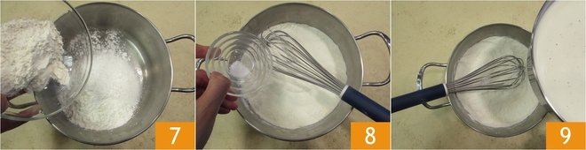 Add the flour, also sifted 7, and a pinch of salt 8. Stir with the whisk, and as soon as the milk starts to boil, pour a small portion into the dry ingredients 9.
