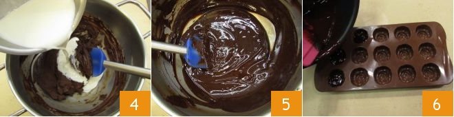 then pour the warm liquid cream 4. Stir with a spoon to combine the mixture, which should be very fluid 5. Pour the obtained ganache into a silicone mold for chocolates 6.