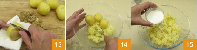 Meanwhile, when the potatoes are cooked, peel them while still hot 13, place them in a bowl and mash them with a fork 14. Add the fresh cream 15,