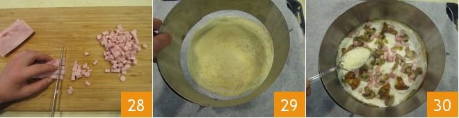 Dice the cooked ham 28, then take a springform ring and place it on a baking tray lined with parchment paper 29 and start assembling the cake: lay down a crepe layer, pour the bechamel, add the mushrooms, diced ham, a bit of grated Grana Padano cheese 30
