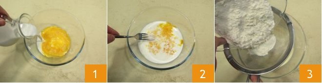 To prepare the mushroom crepe cake, start with the Sweet and savory crepes (Basic recipe) batter: melt the butter in a saucepan over low heat, then let it cool. In a large bowl, pour the eggs and beat them with a fork, add the milk 1 and mix the ingredients 2. Then sift the flour into the bowl with eggs and milk 3,