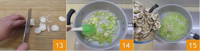 Then proceed by slicing the leek into rounds 13, sauté it in a pan with a little oil 14, let it stew for about 5 minutes, then add the champignon mushrooms 15,