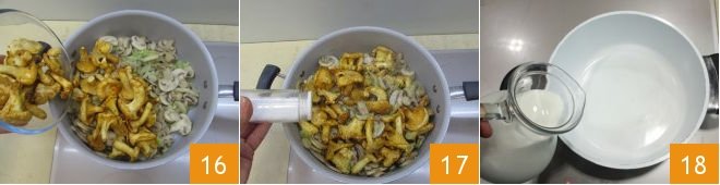 the chanterelles 16, adjust with salt 17 and pepper, and cook them for at least 20 minutes. In the meantime, prepare the Béchamel sauce: heat the milk in a saucepan 18,