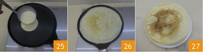 After the required time, heat a crepe pan or a large non-stick pan (with a diameter between 7 and 9 inches) and grease it with a little butter; pour a ladle of batter in the center 25 and spread it over the entire surface with the appropriate tool. Cook the crepes for one minute 26, moving the pan occasionally or using a spatula to detach them from the bottom, then flip them to cook the other side. As you make the crepes, place them one on top of the other on a serving plate 27.