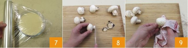 then transfer it to a bowl, cover it with plastic wrap 7 and place it in the refrigerator for at least 30 minutes. Then take the champignon mushrooms: remove the soil from the stem with a knife 8, clean them with a damp cloth 9