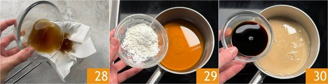Meanwhile, prepare the sauce: filter the mushroom soaking water with a paper towel 28 and pour 7 oz into a saucepan along with the cornstarch 29 and soy sauce 30.