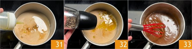 Add the oil 31 and pepper 32, then turn on the heat and let it thicken, stirring often until you obtain a smooth and thick sauce 33.