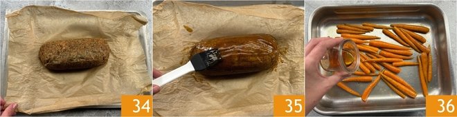 After 30 minutes, remove the meatloaf from the oven and open the package 34, then brush it with the mushroom sauce 35. Return the meatloaf to the oven uncovered and bake for another 20 minutes, still at 350°F. Once cooked, also remove the carrots and drizzle them with maple syrup 36.