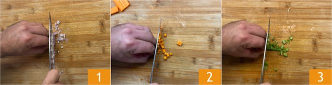 To prepare the mushroom sauce, first soak the porcini mushrooms in cold water for about 20 minutes until they are rehydrated. Finely chop the shallot with a knife 1. Peel and cut the carrots, first into strips and then into 1/2-inch cubes 2. Cut the celery in the same way 3.
