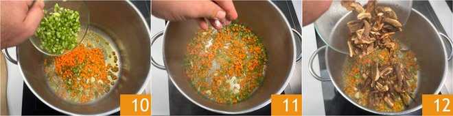 Add the celery 10, season with salt 11, and cook over medium heat for 3 minutes. Add the porcini mushrooms 12 and continue cooking over high heat for 5 minutes, stirring occasionally.