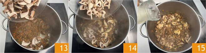 Then add the portobello mushrooms 13 and after 3 minutes the champignons 14. Cook for 5 minutes and deglaze with the white wine 15.