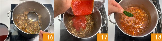 When all the alcohol has evaporated, add 4 ladles of the porcini water 16 and continue cooking for another 5 minutes. Then add the tomato sauce 17, a fresh bay leaf 18, and another 3 ladles of porcini water. Mix well and cook on low heat for about 1 hour.