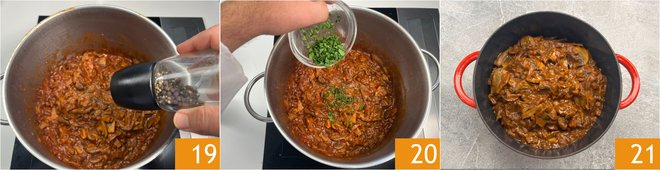 When the sauce has thickened, add the pepper 19, chopped parsley 20, and mix. Taste and, if necessary, adjust the salt. Your mushroom sauce is ready to be enjoyed 21!