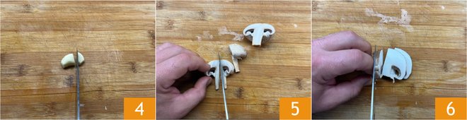 Clean and cut a clove of garlic in half 4. Cut the champignons into quarters 5, slice the portobello mushrooms 6, and set aside.