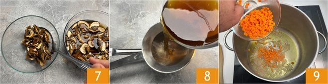 Drain the porcini mushrooms well 7 and filter their water through a fine-mesh sieve 8. In a pot, pour the oil, add the garlic, shallot, and carrots 9.