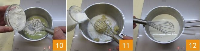 When it melts, add the flour while continuing to stir with the whisk to avoid forming lumps 10. Add the milk while continuing to stir 11, adjust the salt, and let it thicken over gentle heat 12.