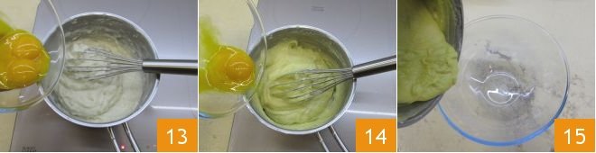 When the ingredients are well mixed and the mixture is thick, add the egg yolks (set aside the egg whites that you will need later). You can add them a little at a time, two yolks together 13, stirring to incorporate them into the mixture, and then add the third 14. When the yolks are absorbed, transfer the mixture to a bowl and let it cool 15.