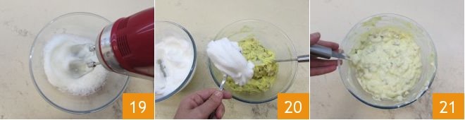 Then, beat the egg whites to very stiff peaks with an electric mixer 19 and gently incorporate them into the mixture by stirring from top to bottom to avoid deflating them (20-21).