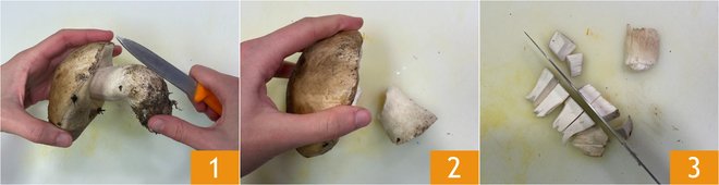 To prepare the mushroom soup, first make the Vegetable broth and keep it warm. Clean the mushrooms: remove the soil from the stems of the porcini using a small knife 1, then gently wipe with a cloth. Separate the cap from the stem 2: slice the first and cube the second to about 3/4 inch 3.