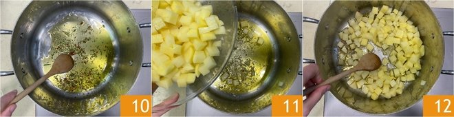 Let it season for a minute 10, then add the potatoes 11 and stir to brown them briefly 12.
