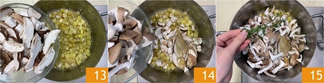 Add the porcini stems 13, oyster mushrooms 14, and thyme sprigs 15.
