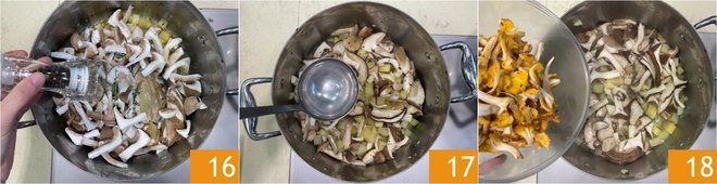 Salt and pepper 16. Cover with vegetable broth 17 and cook for 20 minutes on low heat. After this time, add the chanterelles 18.