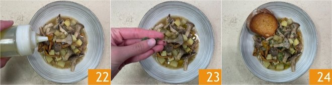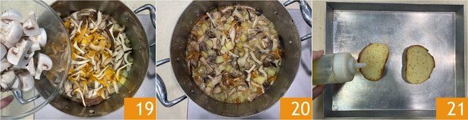 Add the button mushrooms 19 and the porcini caps. If necessary, pour in a bit more broth and adjust the salt. Continue cooking for another 20 minutes 20. Meanwhile, toast the slices of bread in a preheated static oven at 350°F for about 15 minutes 21.