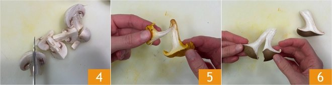 Clean the button mushrooms and cut them into wedges 4. Also divide the chanterelles 5 and the oyster mushrooms into wedges with your hands 6.